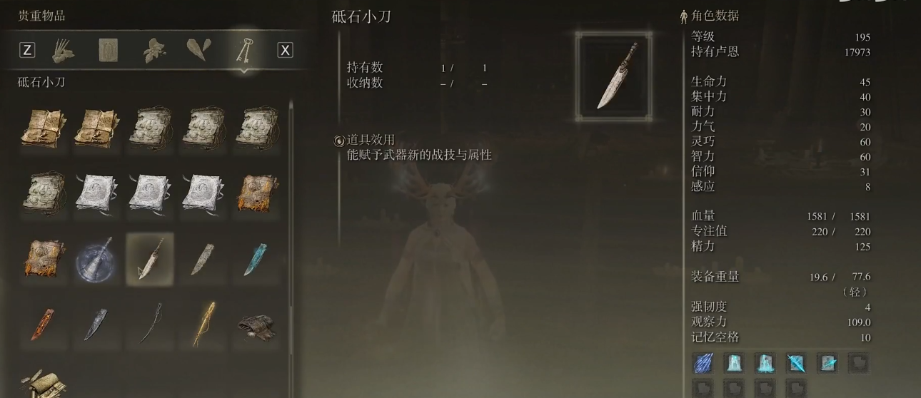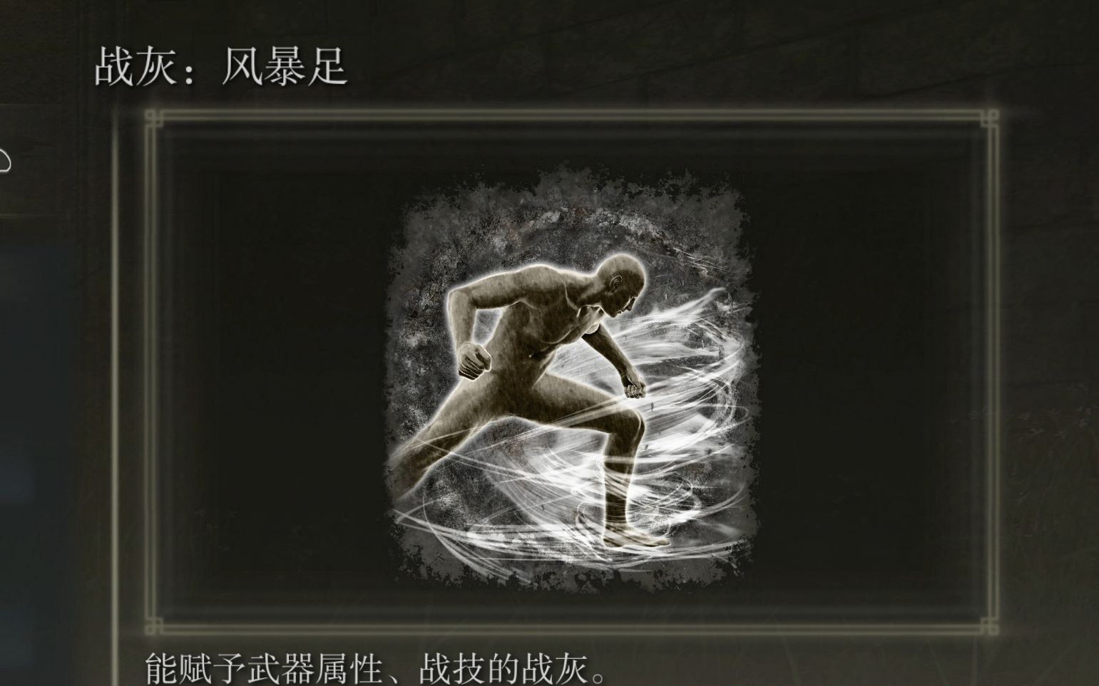 战技是战斗中至关重要的能力,需通过特定流程安装到武器或盾牌上。首先需获取关键道具砥石小刀,该道具位于宁姆格福的关卡前废墟地洞内的宝箱中,开启后同时可获得战灰风暴足。砥石小刀是解锁战技安装功能的基础,未获取前无法为武器附加战技。