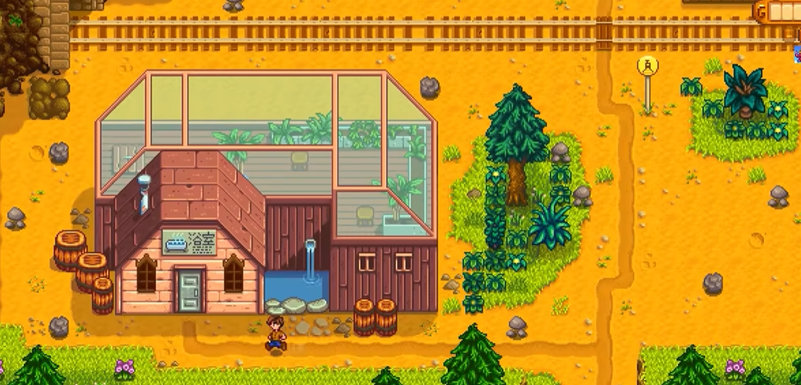 从农场出发后,玩家需要先向北移动至星露谷镇北部区域。通过社区中心右侧的桥梁后,沿着铁轨继续向右前进。这段路程中可能会遇到一些野生植物和其他可收集物品。沿着铁轨行走不久就能看到一个小木屋,这就是温泉的入口处。温泉24小时开放且当日可多次使用,但需要注意冬季积雪会减缓移动速度。