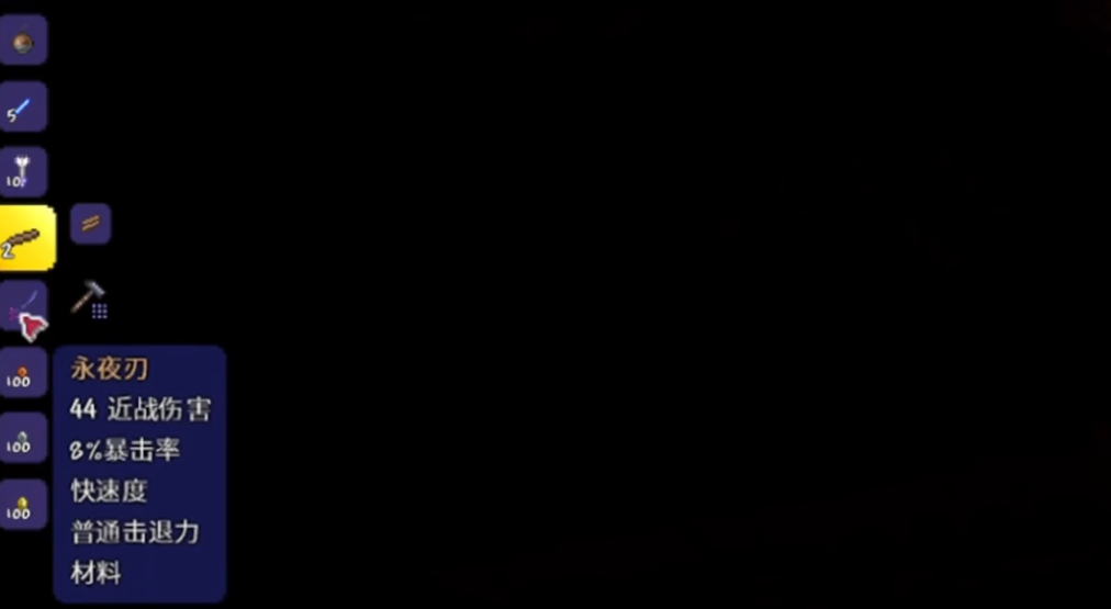 永夜之刃是一把强力的近战武器,需要通过特定材料合成获得。基础版本永夜之刃需要四把武器作为材料:血腥屠刀/魔光剑、草剑、妖刀村正和炽焰巨剑。这四把武器需在恶魔祭坛或猩红祭坛处合成,最终得到永夜之刃。真永夜之刃则需要使用基础永夜之刃与20个恐惧之魂、20个力量之魂和20个视域之魂在秘银砧或山铜砧处进一步合成升级。