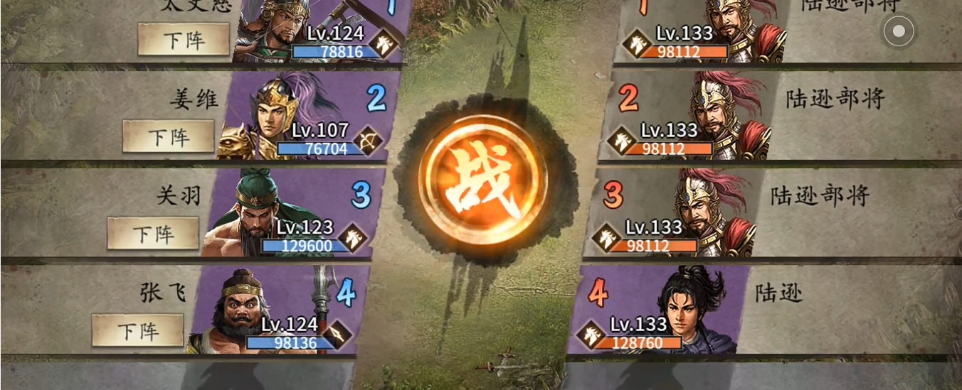 开局让太史慈和周泰先手,太史慈起手战法后平砍,最后一排残血时再放战法,如果能触发斩杀就更好了。周泰的任务是和第二个部将的第一排同归于尽,为后续武将创造优势。接着张飞上场,平砍到残血时释放战法,尽量消耗敌方兵力。关羽出场后要注意节奏,如果出两次克制就能轻松打到陆逊面前,最后用战法抵挡陆逊的火烧联营。