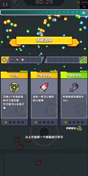 开局5分钟内必须集中资源觉醒苦无,期间避免拾取小BOSS掉落的宝箱。保留场上的炸弹用于应对密集怪群,待苦无满级后利用经验卷轴最大化收益。5-10分钟阶段优先升级守卫者、导弹等突围武器,攻击力与攻速辅助技能需同步强化。10分钟后需立即处理红海盗刷新机制,通过守卫者与导弹开辟路径,利用腰带无敌时间完成突围,此阶段严禁触发炸弹以免重置怪物刷新。