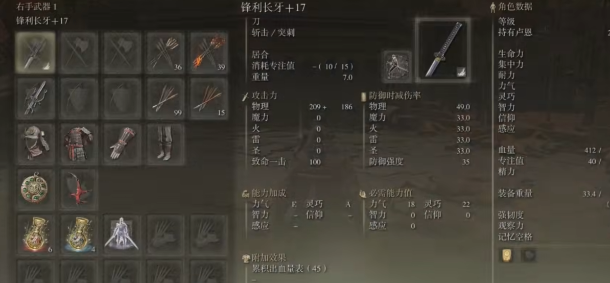 武器选择上,打刀与长牙是武士的核心过渡装备,前者自带出血效果且战技居合削韧优秀,后者需18力量与17灵巧,可通过击败血指涅利乌斯获取。后期推荐切换为尸山血海或名刀月影,前者强化出血连击,后者适合智敏双修流派。护符首选拉达冈的糜烂烙印,可同时提升力敏血精属性,解决前期属性点紧张问题;曲剑护符能强化防御反击效率,配合大乌龟壳盾牌形成攻守兼备的战术体系。战灰方面,鲜血斩击与切腹战技可显著提升爆发伤害,但需注意血量管理。