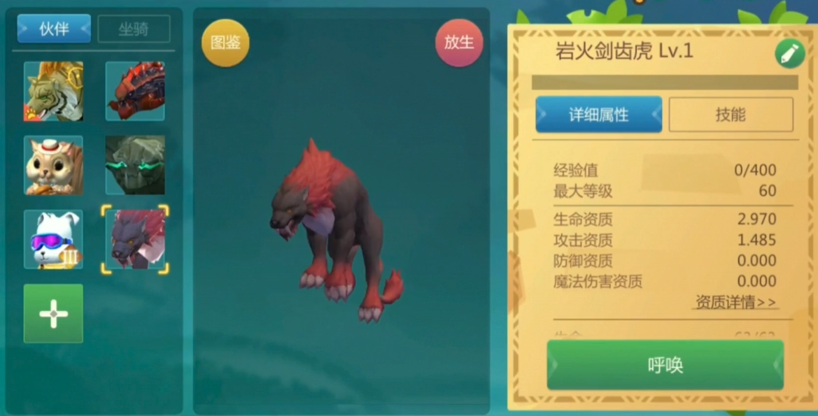 驯服后的岩火剑齿虎是个很实用的伙伴,既能当坐骑又能参与战斗。它的移动速度相当不错,负重能力也够用。战斗时能使用破甲技能,对敌人造成可观的伤害。平时带着它出门探险或者采集资源都很方便,是个值得花时间培养的宠物。