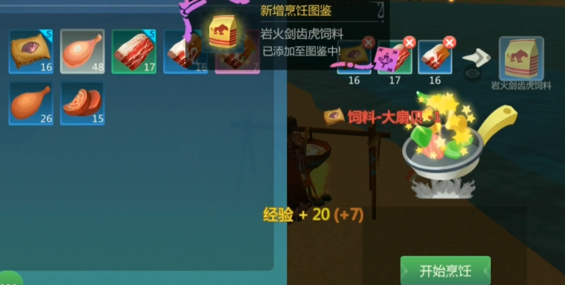 驯服岩火剑齿虎,首先得准备好它的专属饲料。制作这种饲料需要三种关键材料:大扇贝饲料包、优质饲喂肉块和稀有饲喂肉。把这些材料放进烹饪锅里点击开始烹饪,就能得到岩火剑齿虎饲料了。建议一次性多准备些,因为驯服过程中可能需要喂食多次,通常准备16-17包比较稳妥。