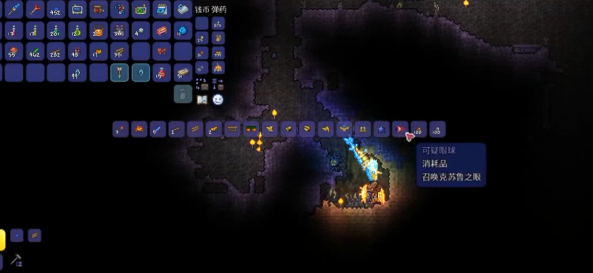 可疑的眼球是泰拉瑞亚中用于召唤克苏鲁之眼的重要道具,玩家可以通过两种主要方式获取这一物品。第一种方法是在洞穴和地牢中的金箱内随机发现,包括冰冻箱和地下丛林的常春藤箱。第二种方法是通过合成获得,需要收集6个晶状体并在恶魔祭坛或猩红祭坛处制作。晶状体有33.33%的几率从恶魔眼和游荡眼球怪身上掉落。