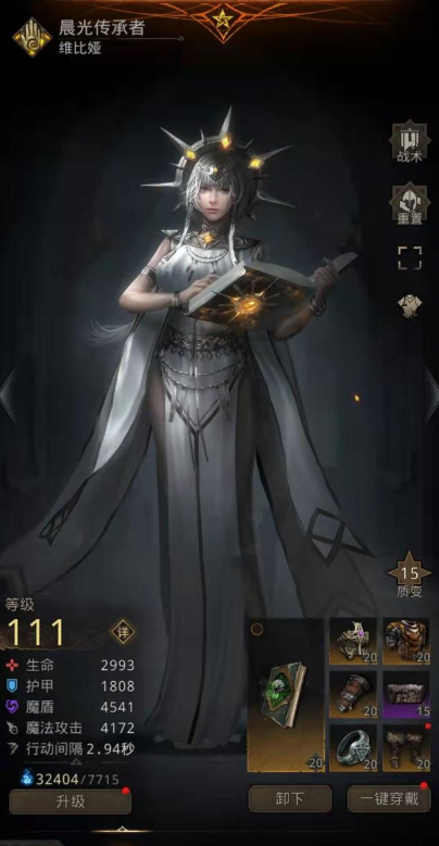 晨光传承者是咱们在游戏里能遇到的强力奶妈,金色品质的支援职业英雄,技能全跟回血和净化有关。她的战吼技能曙光能给全队加血,溢出的治疗量还能转化成护甲,顺便清除队友身上的负面状态。被动技能魔爆提升魔法攻击,让奶量更足。这英雄特别适合持久战,队伍里带她基本不用担心续航问题。