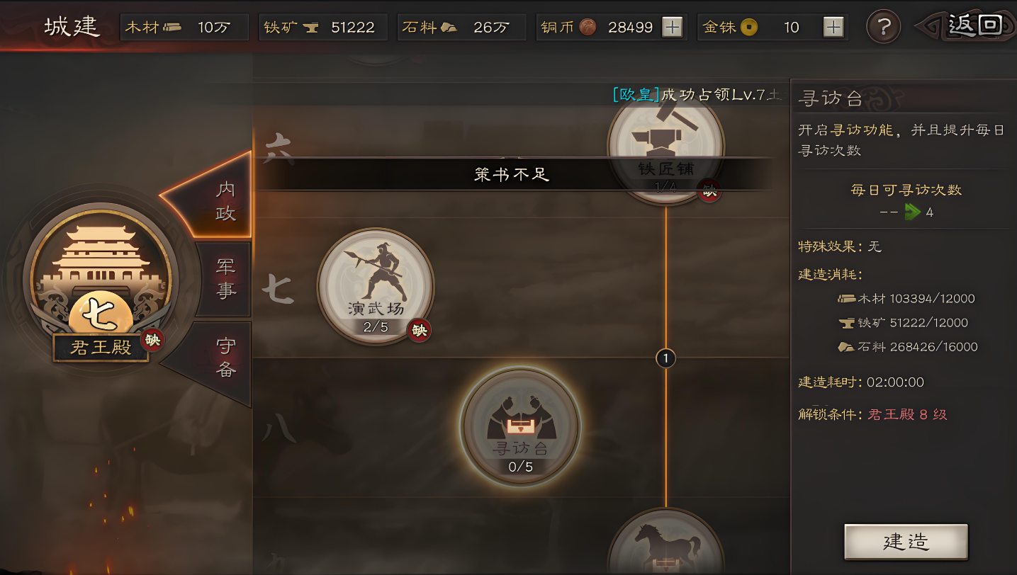 军营建筑是提升兵力的核心设施,升级军营可直接增加所有武将的带兵上限。君王殿达到7级是建造兵营的前提条件,因此优先发展主城建筑至关重要。城建系统中的兵站类建筑能提升武力、谋略等基础属性,间接增强部队整体实力。资源分配需优先保障军营及相关建筑的升级需求,确保兵力增长不受物资短缺制约。