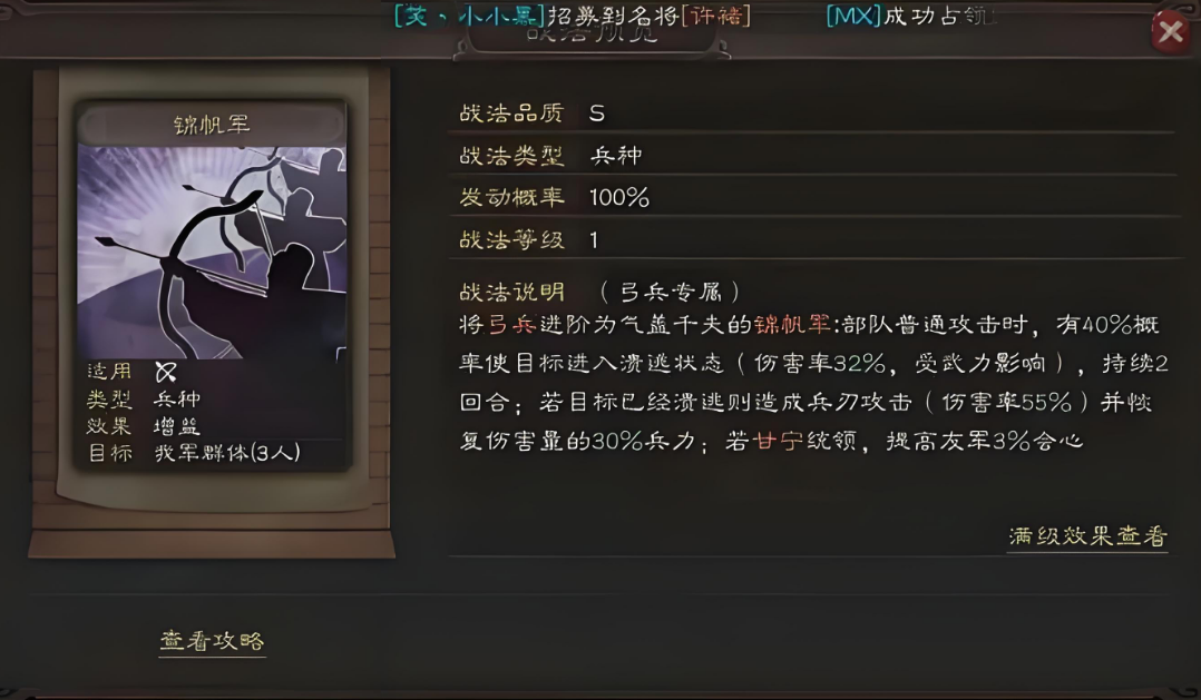 锦帆军在事件战法中消耗一个5星武将甘宁完成兑换。这个兵种是弓兵专属,特点是普通攻击时有40%概率让目标进入溃逃状态,如果目标已经溃逃,则会额外造成兵刃伤害并恢复兵力。甘宁作为统领时,还能提高全队的会心几率,让输出更上一层楼。