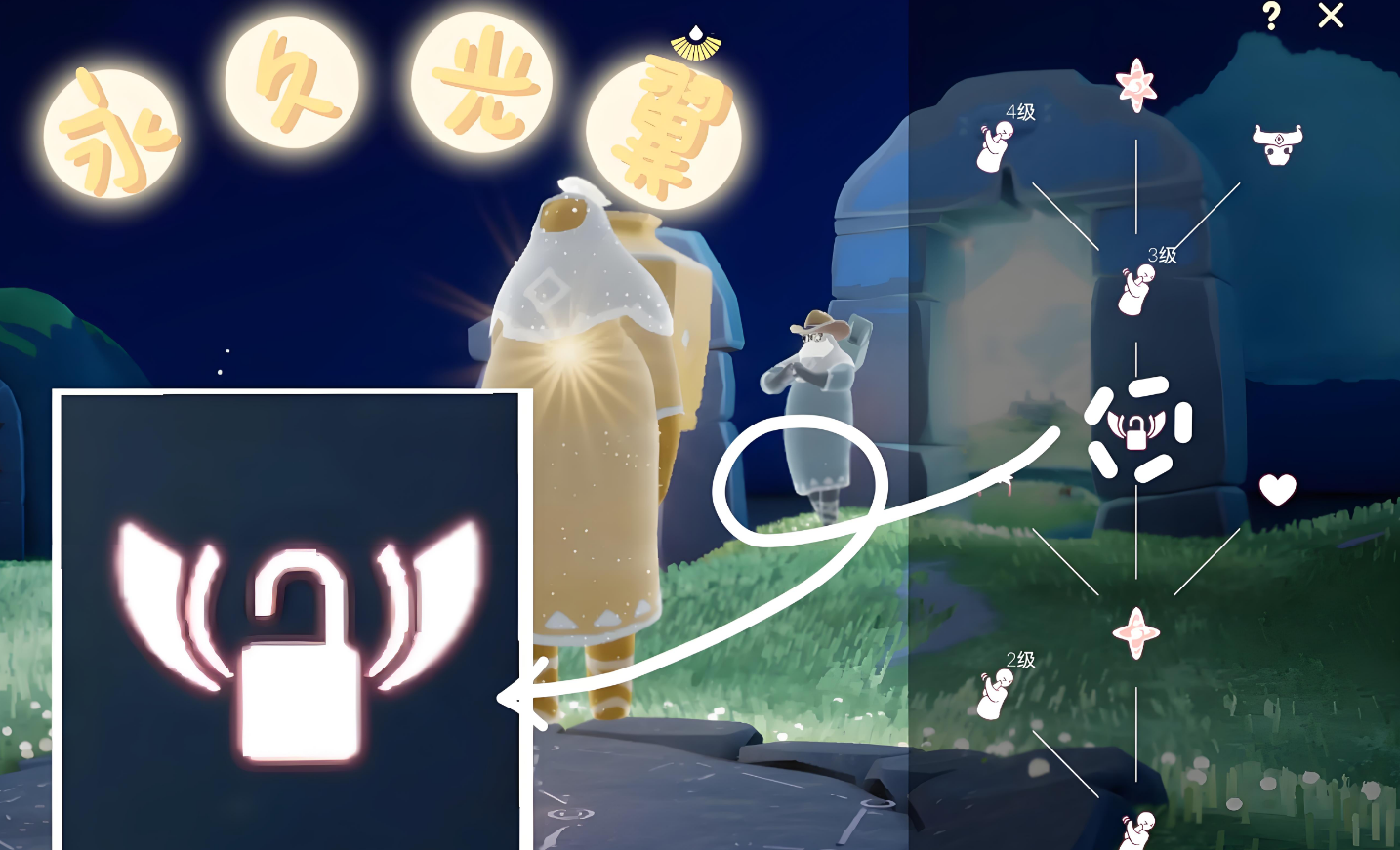 获得永久光之翼,关键在于解锁先祖节点并使用升华蜡烛兑换。永久光之翼和普通光之翼最大的区别在于,即使被冥龙撞掉或淋雨消失,重生后依然可以通过先祖直接领取,不需要重新跑图收集。解锁方式很简单,先在暴风眼献祭获取升华蜡烛,然后在星盘中选择先祖的光之翼节点兑换即可。