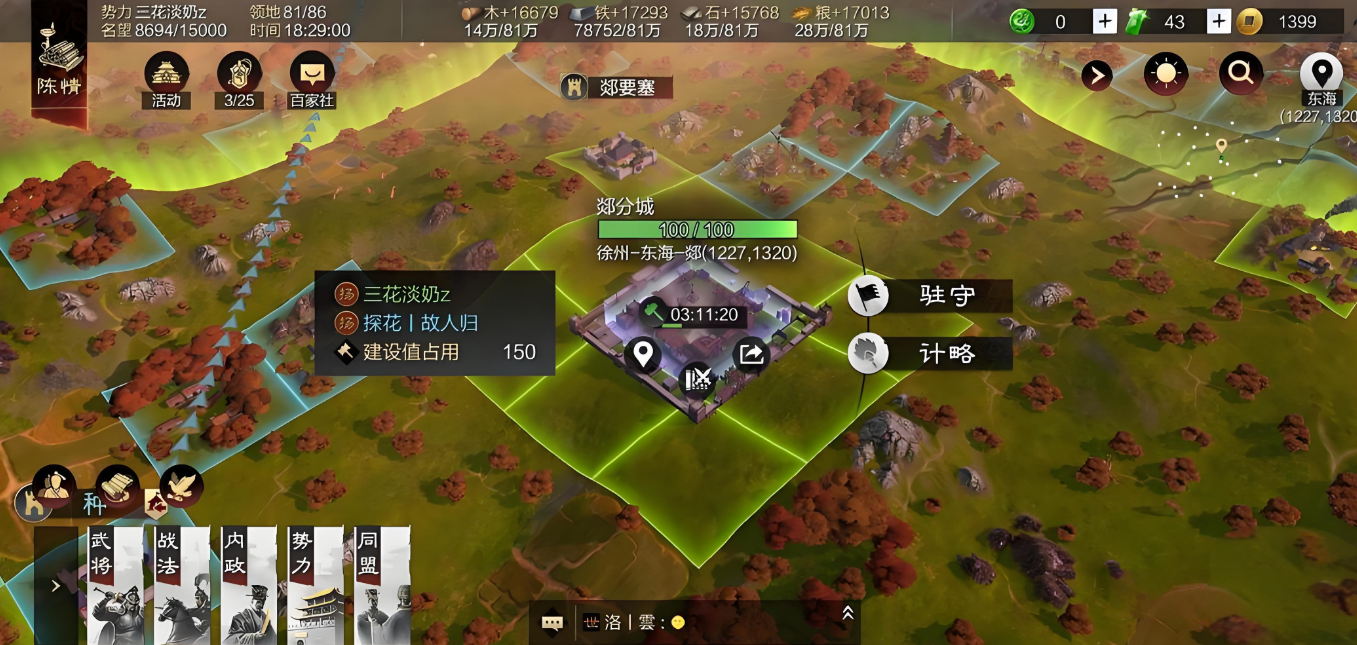 分城的建立是玩家提升资源获取能力和战略布局的重要途径。分城的功能与主城类似,可以建设相同的建筑和配置部队,但其资源产出和特殊建筑能为玩家带来额外收益。占据九块3×3九宫格形状的资源地(不能是山、水或NPC城市等)、筑城土地周围2圈内没有其他玩家的地块或自己的分城、名望值达到6000以上。建造时需消耗25000木材、25000铁矿、35000石料、20000粮草以及5个政令。