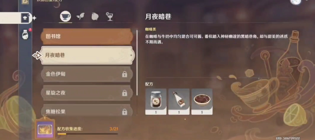 调酒过程中可能会遇到材料不够的情况,别担心,咖啡和牛奶在蒙德城的杂货店就能买到,可可酱则需要稍微留意下每日商店刷新或者完成委托任务获取。如果暂时缺某种材料,可以先囤着等凑齐再制作,毕竟这款饮品没有时间限制,随时都能做。调好的月夜暗巷不仅能交给凯亚完成任务,还能自己留着当回体力的道具,实用性拉满!