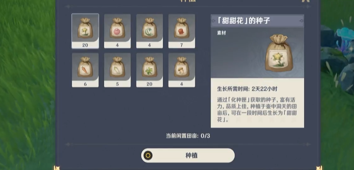 装备化种匣后,每次采集植物时都会额外获得对应种子。比如采集甜甜花不仅能拿到花朵,还能得到甜甜花种子。种子可以在尘歌壶的田地里种植,每种植物都有对应的田亩类型,种植后等待生长周期结束即可收获。化种匣最多能存放20枚同类型种子,记得及时清理背包,避免浪费。