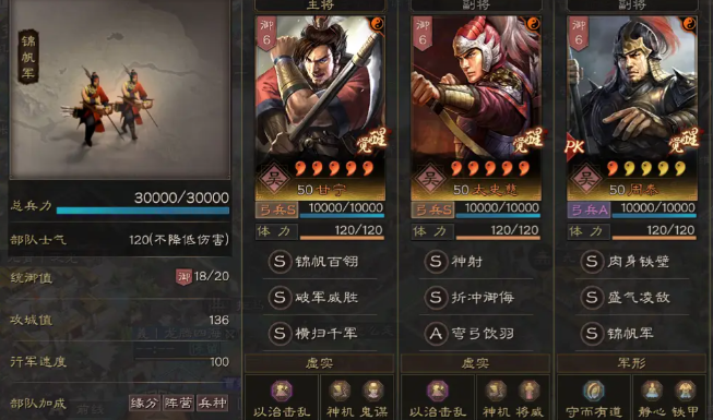 实战中折冲御侮多用于虎臣弓、三势吕等依赖普攻的体系,或司马盾、魏骑等需保护主将的阵容。其降低统率的效果能有效破除敌方防御,尤其对高统率肉盾或高智力谋士具有针对性。由于抵御效果仅对主将生效,布阵时需确保携带武将为副将位,以最大化战法收益。