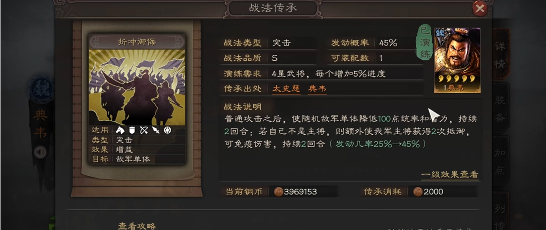 如果咱们想让太史慈在输出的同时,为团队提供强大的辅助和控制效果,那么当锋摧决和折冲御侮这对黄金搭档就值得重点考虑。当锋摧决堪称神技,普攻后不仅能打伤害,最关键的是能伪报目标,直接废掉对手关键的指挥和被动战法,对付那些依赖核心战法的队伍特别有效。折冲御侮则更偏向于保护队友和削弱敌人,普攻后能大幅降低目标的统率(相当于破防),让我方后续输出更疼,并且有概率给对手挂上技穷状态,阻止其发动主动战法,同时还能给我方主将套个抵御护盾,攻防辅一体。这两个战法让太史慈在战场上作用更全面,不再是单纯的打手。