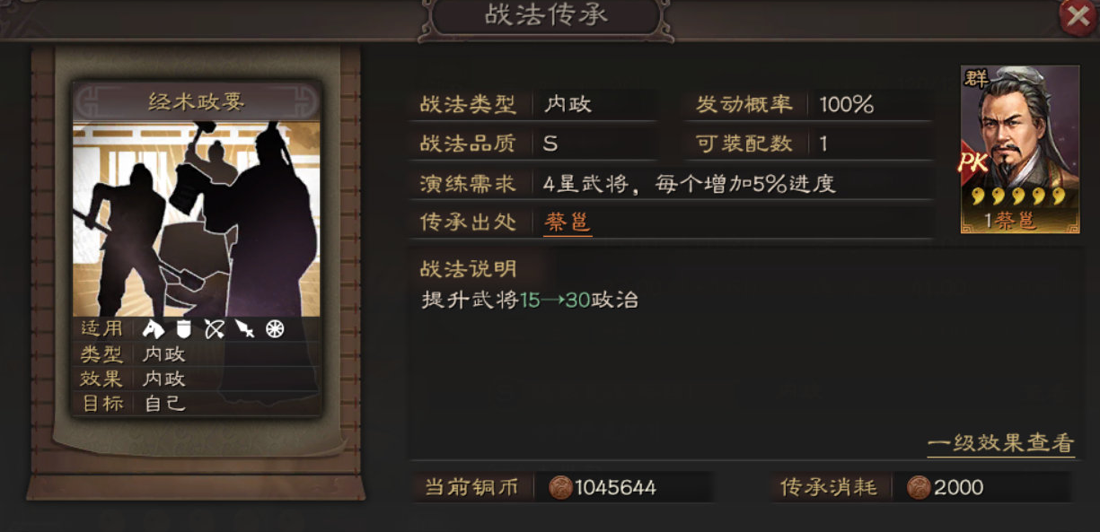 蔡邕的自带战法经术政要进一步强化了他的内政功能。当委任为木材官时,该战法能额外提升木材产量,效果比普通紫卡内政武将更显著。这种设定让蔡邕成为特定场景下的功能性角色,尤其适合偏好稳健发育的玩家。他的战法效果仅针对木材资源,因此需要根据自身需求决定是否重点培养。