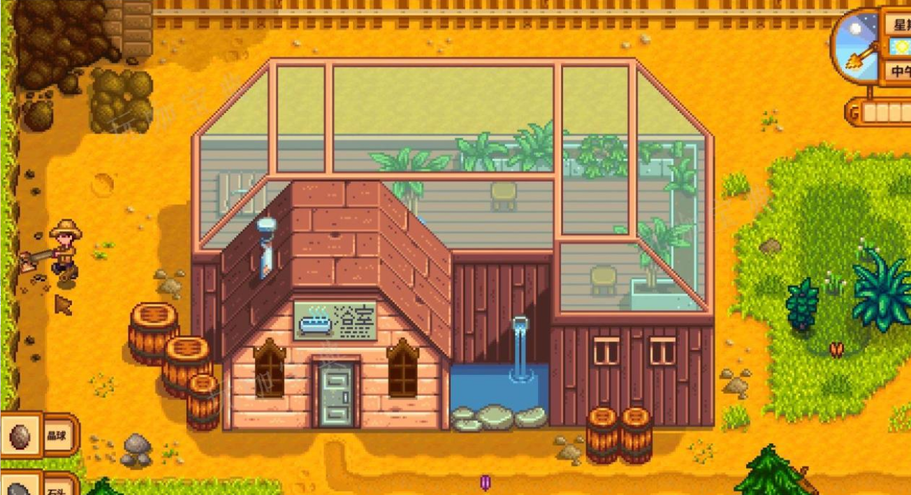 温泉是恢复体力的重要设施,位于农场东北方向的铁路区域。解锁温泉需要等待游戏第一年夏季第3日的地震事件,地震会震开原本被石头堵塞的道路,此后玩家即可前往温泉。温泉的开放时间为每日6:00至24:00,进入后需先在更衣室更换泳装,随后浸泡在池水中静止不动即可缓慢恢复体力。
