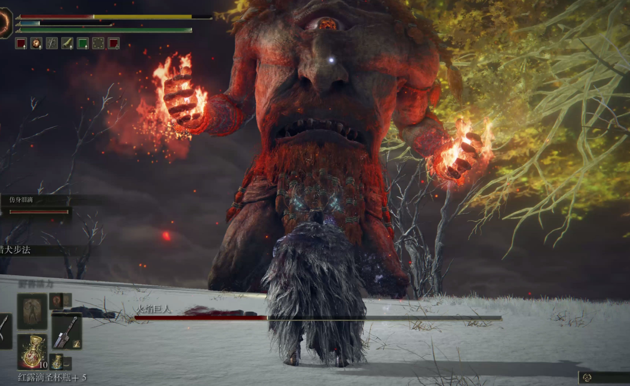 击败火焰巨人后,玩家将获得重要剧情道具火焰巨人的追忆,并触发后续的烧树事件。该区域还隐藏着多个探索要素,如萨米尔废墟的冰风暴战技、监视者要塞的独眼盾等装备,建议在挑战BOSS前充分探索以提升角色强度。