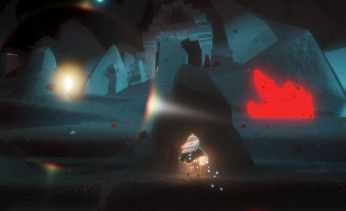 需要穿越布满碎石和红石的狭长阶梯。这段路视线极差,建议跟随地面微弱的烛光指引前进。阶梯两侧的石像可以短暂躲避,但不宜久留。接近终点时会进入伊甸之眼区域,这里需要开始献祭光之翼。献祭时不必等待完整动画,触碰石像后立即寻找下一个目标。整个暴风眼路线需要保持耐心,每次通过一小段距离就寻找安全点,逐步推进才是稳妥的策略。完成全部献祭后将触发重生剧情,获得升华蜡烛奖励。
