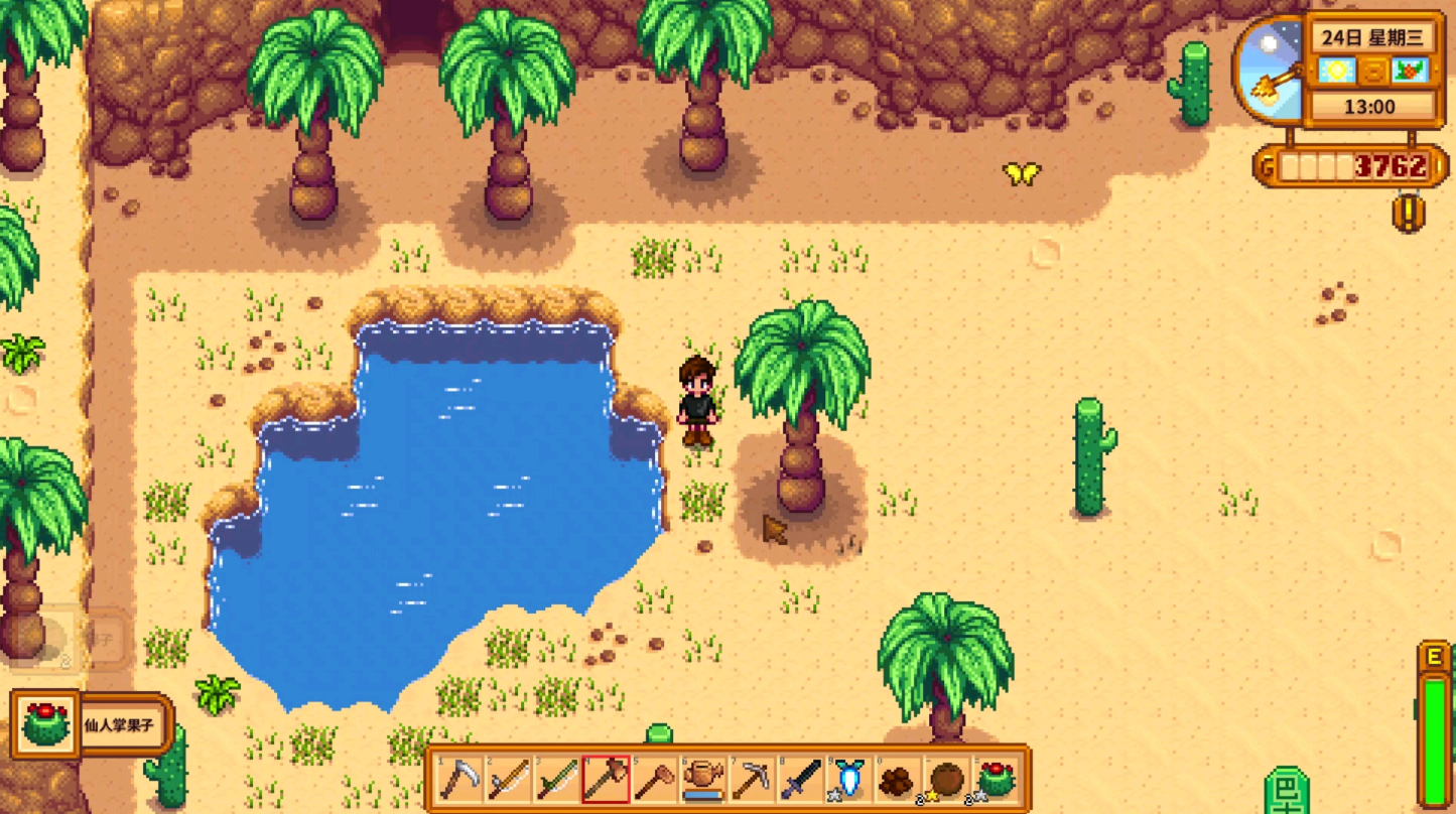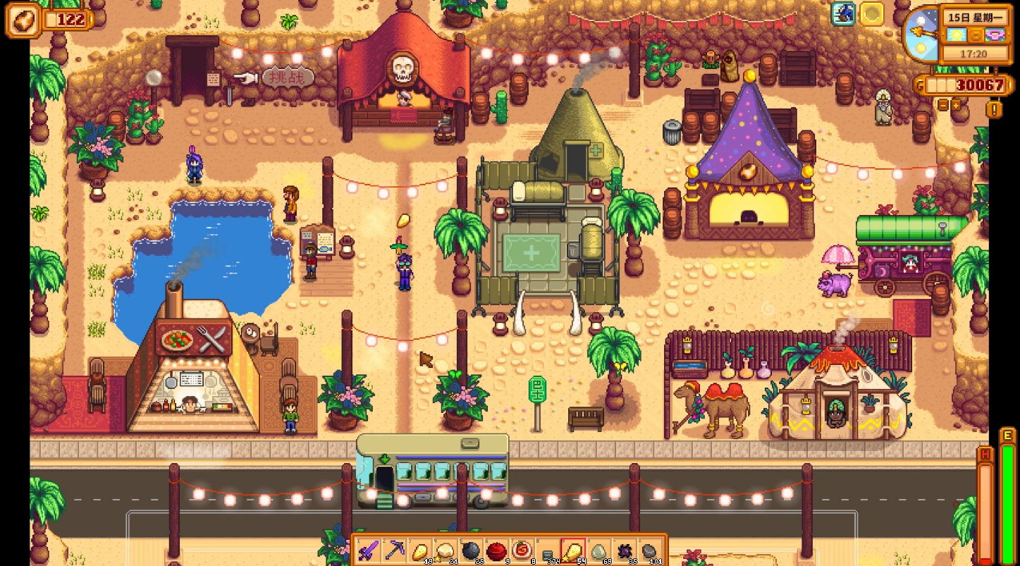 见到沙漠商人,首先得解锁沙漠地图。修复社区中心的废弃大厅后,你会获得一张沙漠巴士票,这是前往沙漠的关键道具。接着记得带上工具去清理沙漠中的沙石和尖刺植物,这样才能找到商人的帐篷。沙漠商人只在阴天或雪天出现,晴天去的话可能会扑空哦,所以出发前记得看看天气预报。