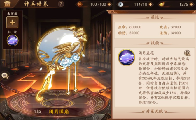 神兵属性优先级需根据战场阶段调整。前期推荐火云剑或雌雄双股剑,利用灼烧或暴击快速压低敌方血量;中后期墨羽扇与闭月团扇更为关键,前者配合毒伤武将持续消耗,后者提供沉默控制。松纹古锭刀适合收割型武将如吕蒙,但群雄阵容中适用性较低。金色神兵丈八蛇矛可分配给高命中需求的武将,如贾诩或貂蝉,弥补技能命中短板。