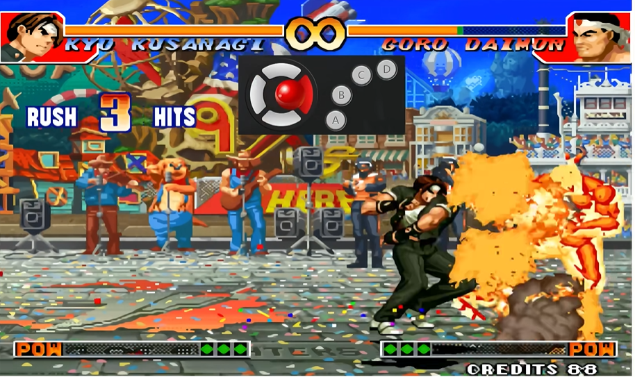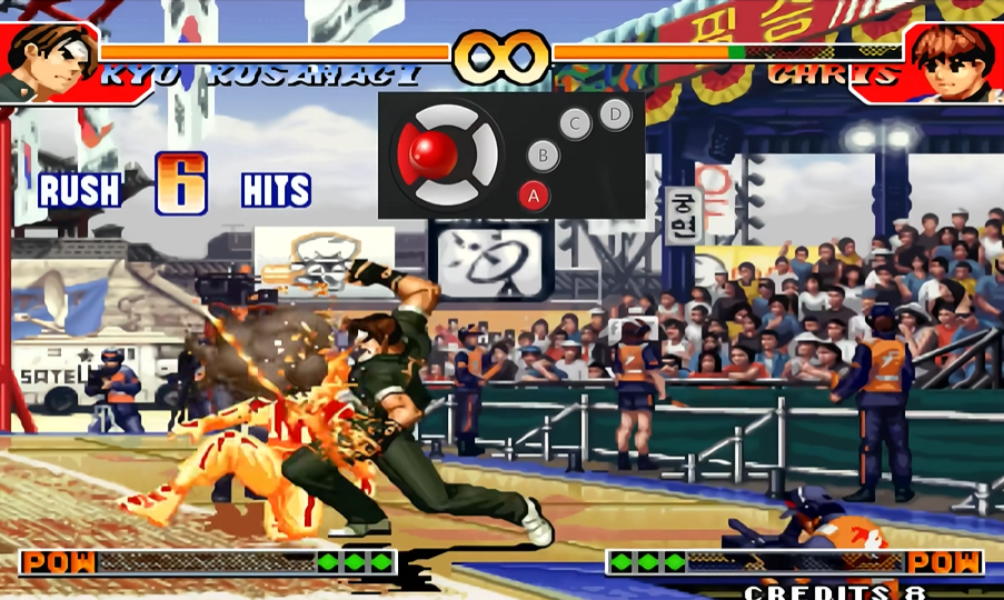 荒咬(↓↘→+A)及其衍生技构成草稚京的核心连招体系。荒咬命中后可接九伤(↓↘→+A/C)形成二段火焰攻击,若输入八锖(→↘↓↙←+A/C)可破防中段对手,而七濑(九伤中+B/D)则适合拉开距离。毒咬(↓↘→+C)的判定范围优于荒咬,通过罪咏(→↘↓↙←+A/C)接罚咏(→+A/C)可形成三段强制连击,但收招硬直较长需谨慎使用。这些技能在版边可衔接七十五式改(↓→+B.B/D.D)提升伤害。