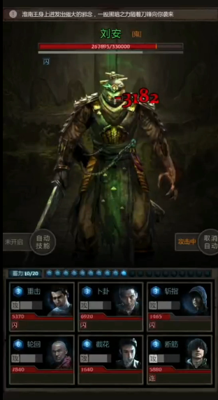 队伍里最好有奶妈和嘲讽角色,比如胖子的嘲讽能吸引火力,让队友安全输出。能量豆一定要攒满再开打,刘安的技能折斩专打血量最低的队友,稍不注意就会团灭。如果被他的铁索连环锁住,基本就得重来了,所以尽量在技能释放前用嘲讽或减伤扛住。刘安血量很高,但只要能稳住节奏,慢慢消耗就能过关。