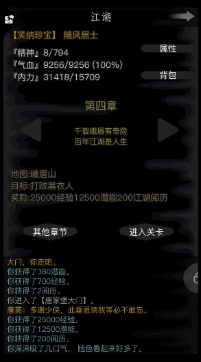 峨眉山作为第四章的主要场景,玩家需要完成江湖送信任务并与黑衣人切磋。送信任务的目标包括闵爽、柳柔、谢依依三人,具体路线为:闵爽位于清音阁向左走到洗象池,再至万行庵后下行至金顶;柳柔需从清音阁左行至洗象池后一路向下到华藏庵;谢依依则需从峨眉山山门直行至中峰寺。完成送信后可获得潜能、装备等奖励,同时需注意部分任务需与NPC反复对话触发后续剧情。