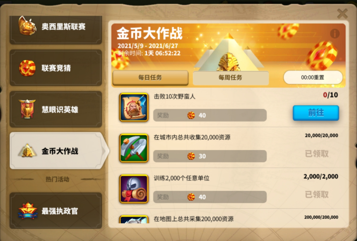 每日活跃度任务必须做完,只要达到100点活跃度就能领到100宝石和一把黄金钥匙,任务内容很简单,比如训练部队、采集资源这些基础操作,坚持每天完成就能稳定积累。主线任务和时代突破也会根据市政厅等级奖励大量宝石,所以优先升级市政厅是稳赚不赔的选择。