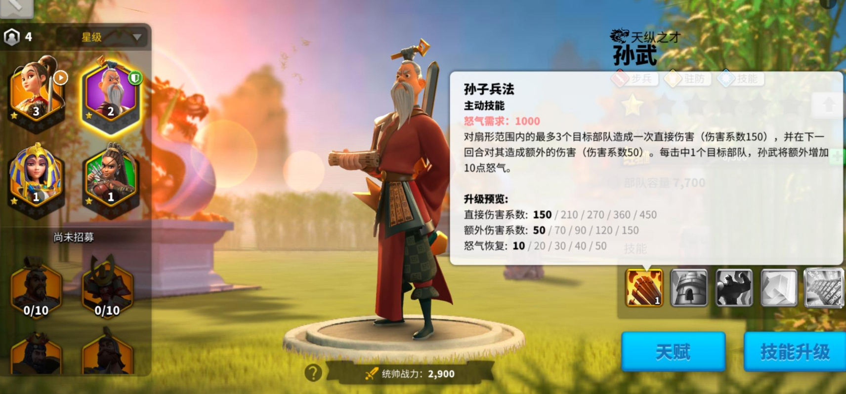 紫色武将中孙武性价比最高,觉醒后群体伤害加减伤效果显著,适合搭配理查或查理马特。贞德的怒气回复和三维增益能大幅提升团队输出频率,建议放在中间位置。埃塞尔弗莱德的群体破防效果可强化李成桂的AOE伤害,混兵比例建议10%步骑+80%弓兵。骑兵队需注意避开敌方理查,优先锁定后排脆皮目标。
