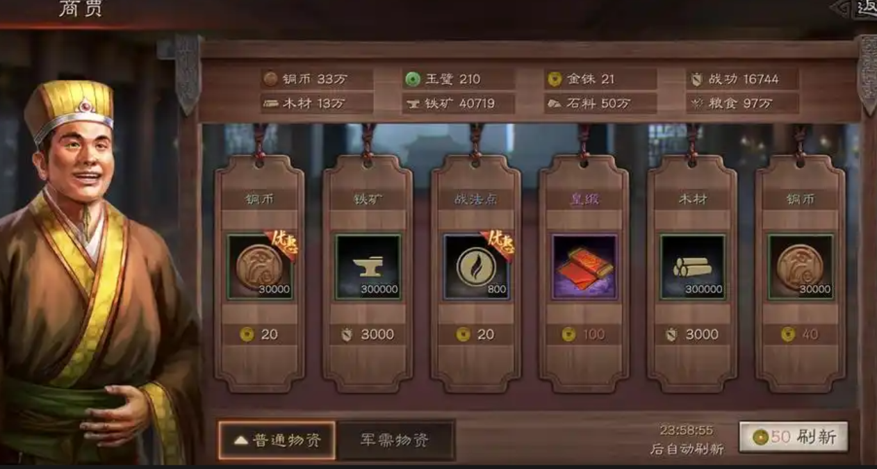 游戏内商店系统提供稳定的铁矿获取渠道。政厅的军需商店中可用战功兑换指定类型和数量的铁矿,每周刷新一次,消耗50金铢可立即刷新。讨伐贼寇获得的战功是主要兑换资本,因此保持PVP活跃度很重要。商贾系统中的货布商店也会定期上架铁矿商品,可用金货布购买。这些商店兑换虽有限购,但能精准补充紧缺资源。