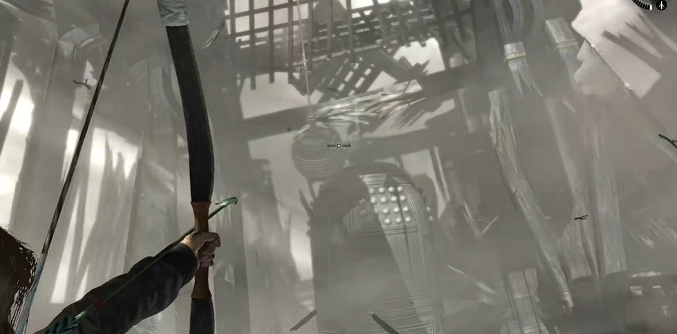 当两边的木柱都被撞坏后,需要将两扇窗户全部打开。站在大钟正前方,再次拉动摆锤撞击上方的主梁结构。这个步骤需要确保风力足够强劲,如果撞击力度不足,可以使用弓箭的绳索功能将钟拉到风口位置增强冲击力。主梁被破坏后,大钟会掉落并砸穿地面,为劳拉开辟新的前进路径。整个过程需要精确控制风力方向和摆锤摆动幅度。