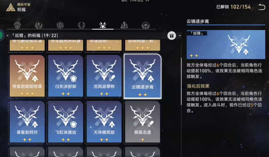 祝福搭配方面,优先选和命途相关的核心祝福。巡猎流重点拿能量回复和暴击加成,毁灭流则要堆战意和减伤。如果碰到通用性强的祝福,比如增加攻击力或者效果抵抗,也可以顺手拿。千万别忽视生存类祝福,模拟宇宙6的BOSS伤害很高,稍微不注意就可能翻车。