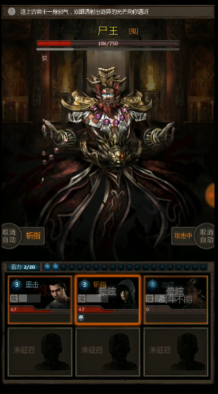 推荐使用胖子、彩儿和吕烽的组合,胖子负责嘲讽吸引仇恨,彩儿专注治疗保证队伍生存,吕烽则全力输出。战斗前记得给全员配备律鬼丹,能大幅减少尸王造成的伤害。开局胖子立刻使用嘲讽技能,确保尸王的攻击集中在他身上,彩儿全程保持治疗,吕烽优先用重击技能快速压低尸王血量。