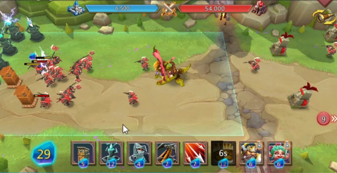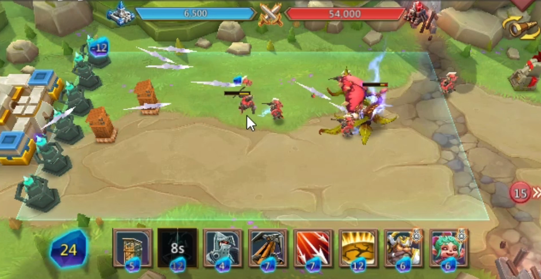 开局先在后方布置防御塔和魔像,别急着往前冲,等敌方英雄靠近再用步兵围剿。图腾这张卡对英雄有200%伤害加成,放在后排输出很给力,但记得用肉盾英雄保护它,因为图腾本身比较脆皮。炮车要优先打掉对面的防御塔,不然咱们的步兵群会被炮台收割得很惨,旋风技能可以留着拆塔用。