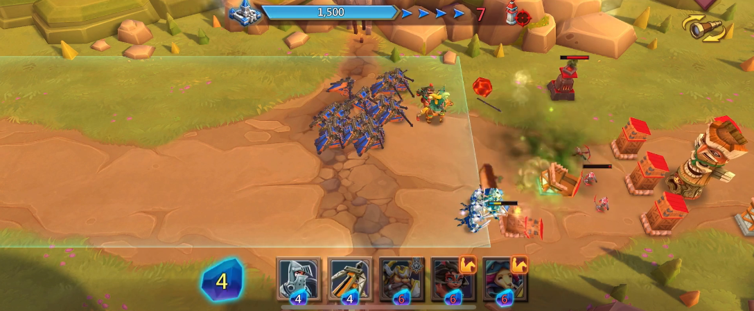 开局阶段优先用火球清理小兵,同时在前排放置边境箭塔。这关的节奏要稳,别急着往前冲,先在后场布置防御工事。等敌方第一波攻势被化解后,再慢慢向前推进。炮车和魔像可以留着对付木不林,旋风技能用来削弱边防塔的血量。如果敌方英雄突然出现,立刻放出图腾或黑牙这类克制英雄的单位,但要注意保护后排,避免被木不林的远程攻击打乱阵型。