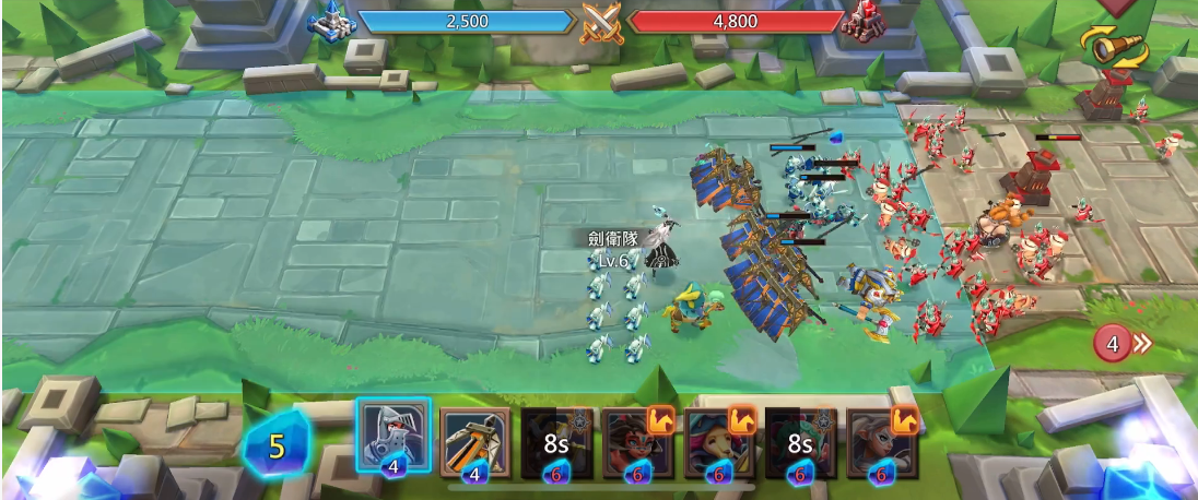 敌人会变成两个双斧怪、一个变异双斧怪和两个远程怪。这时候先打掉血量少的远程怪,减少敌方输出压力。变异双斧怪血厚攻高,需要所有英雄一起集火,别让它存活太久。如果前排压力太大,可以适当用控制技能打断敌人攻击,给治疗争取时间。注意法力值的使用,别在杂兵战浪费关键技能。