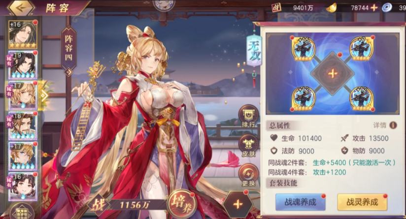 如果想走纯输出路线,后宫队是不错的选择,但需要较高的养成度。丹翎孙尚香作为主C,搭配王元姬提供高频怒攻和奶量,蔡文姬负责治疗和反伤。战魂推荐弱点摇光或爆裂摇光,神兵选择和氏璧、葫芦和弓,强化她的爆发和控场。这套阵容对硬件要求较高,适合战力靠前的玩家。如果资源有限,可以先从女团过渡,后期再转型为后宫队或灭队。