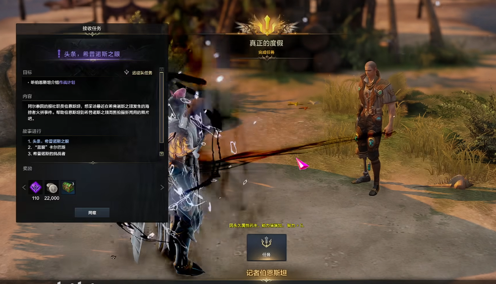 任务的第一步是前往帕普尼卡上方希普诺斯海域,找到前置任务的接取点。接取任务后,跟随指引前往酒馆,与名为蓝眼卡尔巴斯的NPC对话,提交前置任务并接取后续紫色任务。紫色任务会引导玩家在岛屿周围进行探索和交互,但需要注意任务可能中途消失,需走出酒馆查看地图上的黄色任务标记。