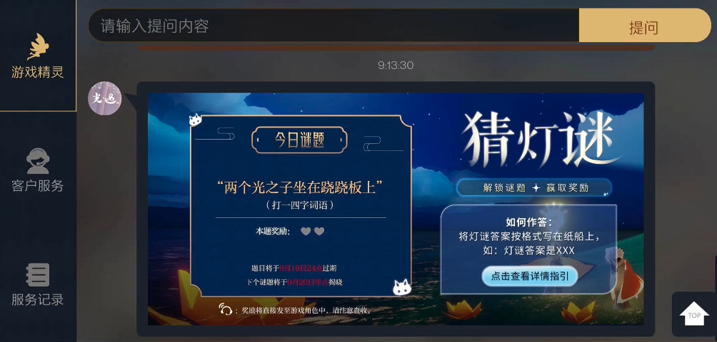 要参加猜灯谜活动,首先需要进入光遇游戏主界面,然后点击屏幕右上角的设置按钮,进入后找到小精灵功能选项,接着在小精灵界面中定位中秋或秋宵节活动的专门入口。这个入口通常会以明显的图标或文字提示展示,玩家只需按步骤点击即可进入活动页面。活动页面会显示当天的灯谜谜面,玩家可以在这里查看题目并进行后续操作。