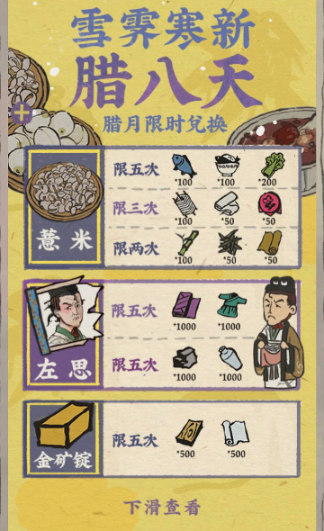 薏米和莲子是活动资源,玩家需要通过资源兑换来获取它们。这些材料在特定的节日活动中出现,主要用于制作腊八粥,从而兑换游戏内的珍贵奖励。获取途径主要集中在州府内的资源兑换界面,玩家可以使用已有的物资如蔬菜、菜肴、肉类等进行交换。参与游戏中的限时活动也是获得这些材料的重要方式。理解这些基本获取方法有助于玩家高效地参与活动并积累资源。