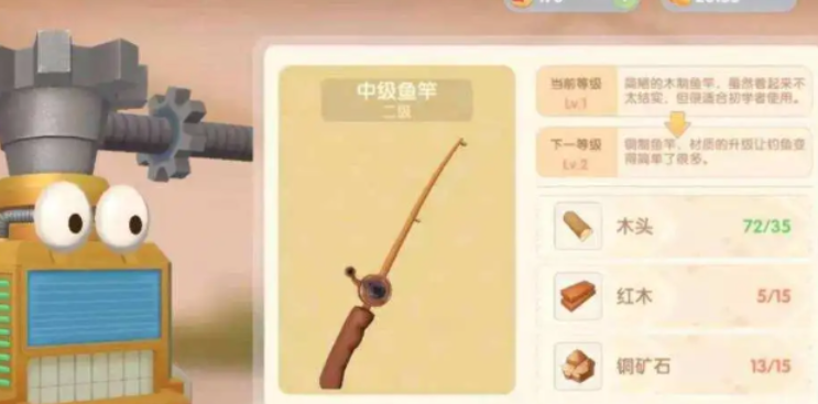 拿到初级鱼竿后,你可能会想体验更高效的钓鱼过程或者挑战更稀有的鱼类,这时候就需要了解鱼竿的升级路径了。游戏中的鱼竿分为初级、中级和高级,它们都需要在特定的地点进行升级。中级鱼竿的解锁需要你的农夫等级先达到15级,然后去梅森小屋找到那里的R7机器人商店。升级需要准备一些材料,包括35个木头、15个红木和15个铜矿石,当然还得支付一笔摩尔豆。当你成功升级到中级鱼竿后,钓鱼时那个绿色的提示圈会变小一些,操作起来会感觉更顺手。
