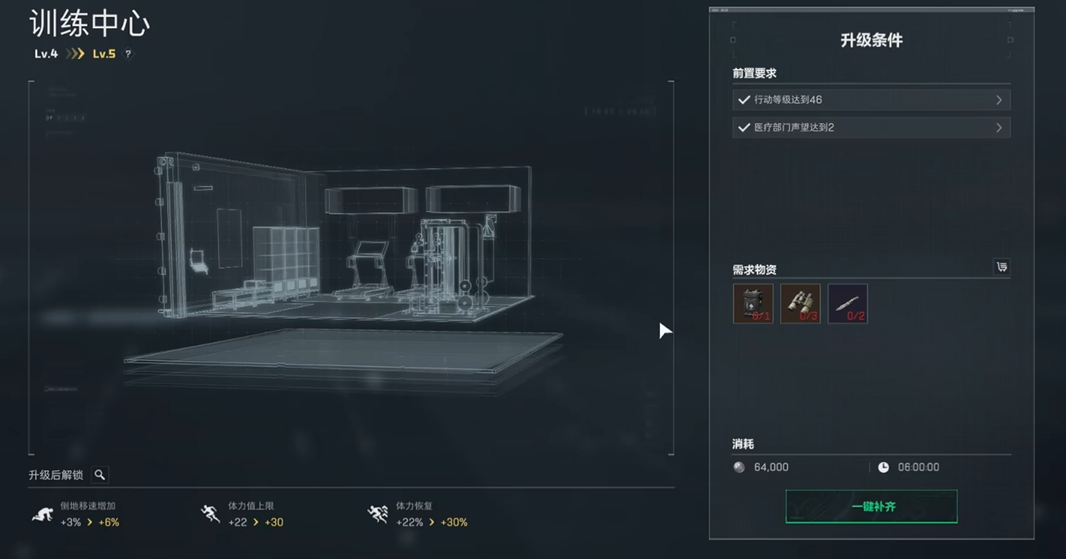 特勤处的升级是强化角色能力、拓展玩法的核心系统。面对多个可升级的部门,玩家需要根据自己最常从事的游戏活动来做出优先选择。如果你热衷于与敌人正面交锋,享受对枪的刺激感,那么战斗部门的训练中心应当是你的第一投资目标。升级训练中心可以直接提升你的体力上限与恢复速度,显著增强作战时的机动性与持续缠斗能力,同时它还能提高被击倒后的移动速度,为你争取到躲入掩体或寻求队友救援的宝贵时间。