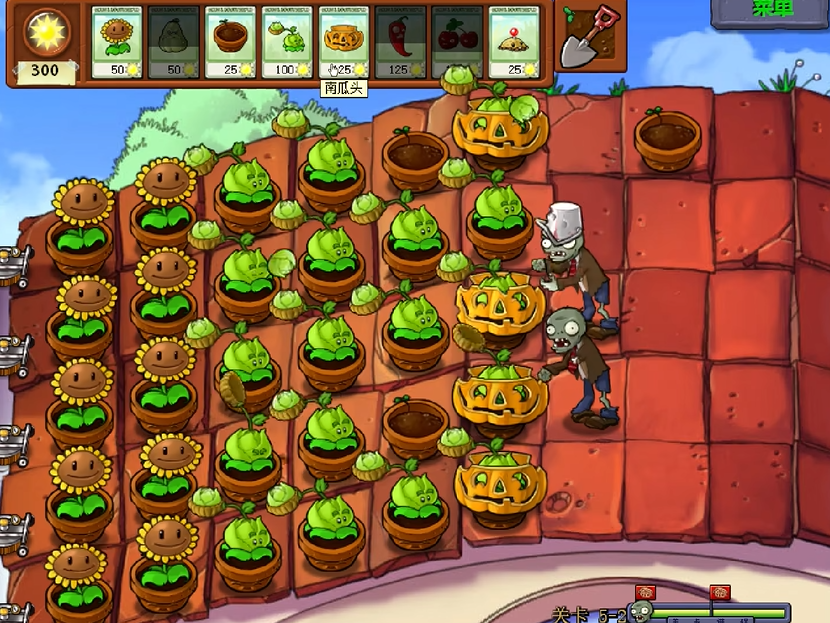 冒险模式的第5-2关位于屋顶场景,这意味着你的防线必须部署在斜屋顶的花盆之上。开局后需要迅速在安全的中间位置放置向日葵以建立阳光经济,同时利用卷心菜投手这类初期植物应对最早出现的僵尸。屋顶关卡的难点在于其特殊地形限制了部分植物的直接种植,且僵尸会从多个斜面的屋顶滑下,要求你更早地建立多行防御体系。
