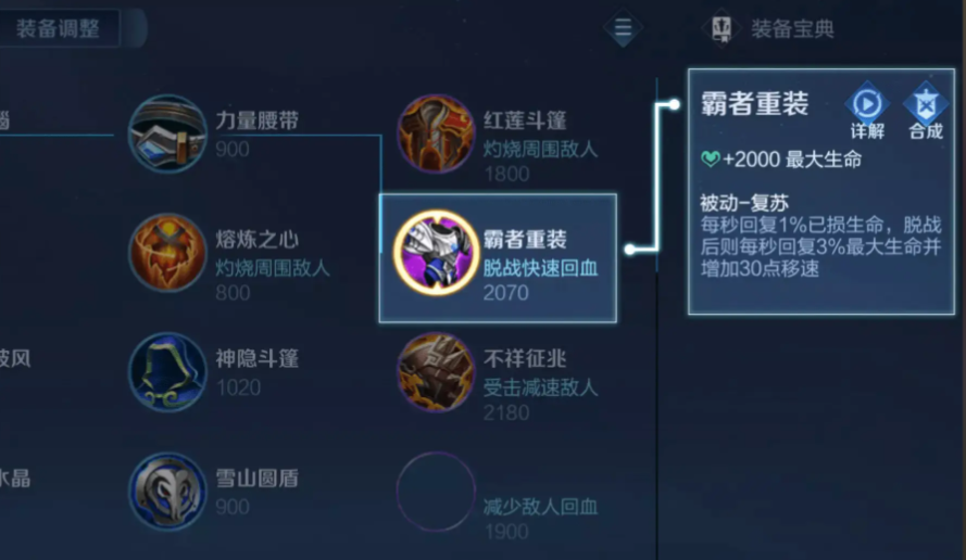 肉装部分的基础装备包括红莲斗篷、魔女斗篷、反伤刺甲、不祥征兆、霸者重装和贤者的庇护。红莲斗篷提供大量生命值与物理防御,被动灼烧效果能增强清线和对附近敌人的持续伤害。魔女斗篷针对法术伤害,提供魔法抗性和一个吸收法术伤害的护盾,有效对抗爆发型法师。反伤刺甲在提升物理防御的同时,能将部分受到的物理伤害反弹给攻击者,适合克制高输出物理英雄。不祥征兆能降低敌人的攻击速度和移动速度,提升团队生存能力。霸者重装大幅增加生命值并提供脱战后的生命回复,支持持久作战。贤者的庇护则提供复活机会,增加容错率。