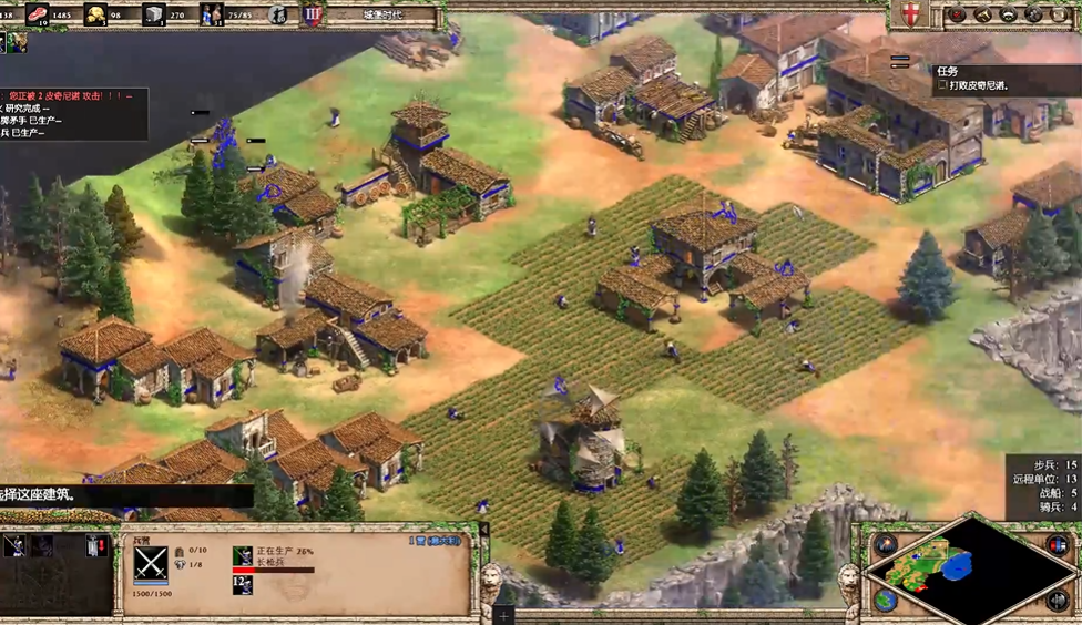 成功占领佩萨罗和里米尼后,游戏进入中期发展与战略推进阶段。此时你拥有了两座城市的资源和经济基础,应立刻着手训练更多村民,重点采集黄金和石料,并升级相关的经济科技以提升采集效率。在防御方面,需要在基地周围的关键位置,特别是容易遭到敌方轻骑兵骚扰的方向,修建城墙和箭塔来巩固防线。军事上,必须尽快建造攻城武器厂,并生产巨型投石机,这是你攻克敌方坚固基地的核心利器。战略上建议先集中兵力,利用巨型投石机远程摧毁皮奇尼诺在北方的基地,然后再调头向南进攻拉文纳城,避免陷入南北夹击的不利局面。进攻拉文纳时,可重复使用引敌出城的战术,确保僧侣能安全放置圣物。