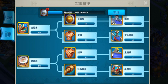 升22堡首要条件是完成所有的前置建筑升级,你得先把城墙、酒馆、采石场、学院这些关键建筑通通升到21级,这步是硬性规定绕不开的。资源方面得提前准备好,大概需要准备粮食16.2M,石头7.0M以及大量木材,如果资源不够就去采集点或者参加联盟活动蹭资源包。这时候加速道具千万别乱花,得攒着留给主堡、学院这些关键建筑的升级冲级用,每天上线第一件事就是检查建筑和研究队列有没有空档,确保发展不中断。 军事科技这条线得优先点,特别是为了解锁T4兵种提升部队战斗力,学院等级一定要跟上主堡节奏,不然科技卡住会拖慢整体进度。建议加入一个活跃的联盟,这样不仅能通过联盟帮助减少建筑时间,还能在联盟矿和超级矿快速获取资源,平时多派部队出去采集,优先囤积石头和粮食,因为后期消耗量极大。还要记得利用好仓库的保护机制,避免辛苦攒的资源被抢导致前功尽弃。
