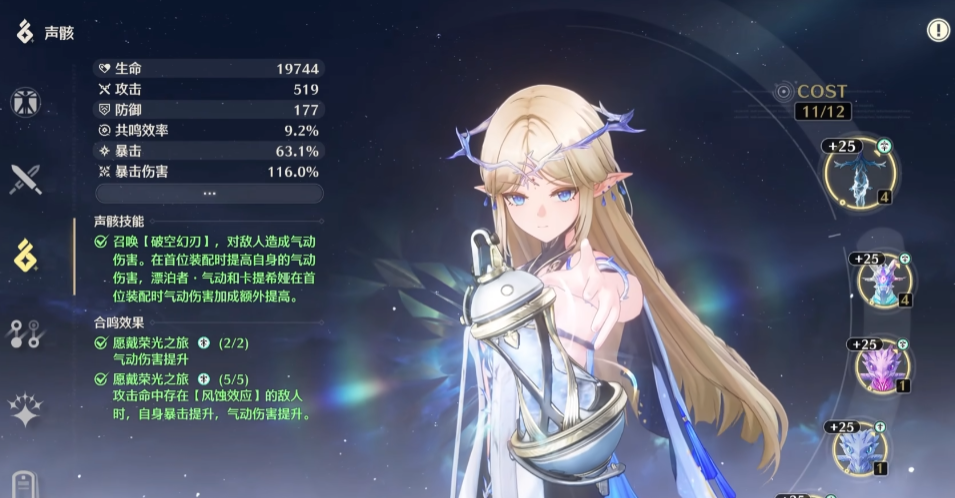 一套完整的输出配置不仅依赖于武器,还需搭配适配的声骸套装与正确的技能升级优先级。在声骸套装方面,愿戴荣光之旅的四件套与一件套组合是卡提希娅的核心选择,其两件套效果提供气动伤害提升,五件套效果能在攻击带有风蚀效应的敌人时大幅提升自身暴击率与气动伤害,这与卡提希娅的输出模式高度契合。声骸主词条上,高成本声骸应追求双暴属性,低成本声骸则堆叠生命值加成;副词条优先选择暴击、爆伤、生命值与普攻伤害加成。技能升级方面,应优先提升共鸣解放与常态攻击的等级,因为这两者是伤害的主要来源,其次再考虑提升共鸣回路与共鸣技能。通过武器、声骸与技能三者的合理搭配,才能让卡提希娅在战斗中发挥出全部实力。
