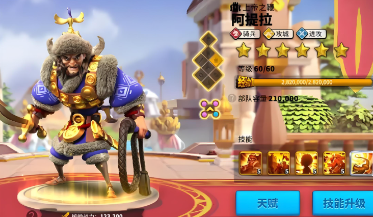 装备与天赋配置需强化生存与反制能力,优先选择附加沉默或降低攻速特效的装备,如无踪龙息套装,以限制阿提拉的攻击频率;驻防天赋树应点满防御系分支,强化减伤与生命值属性,联盟科技则需激活对骑兵伤害的加成条目。阿提拉依赖纯骑兵编队触发技能加成,因此任何混兵行为都会削弱其战力,针对此特性务必确保己方集结部队兵种纯粹化。
