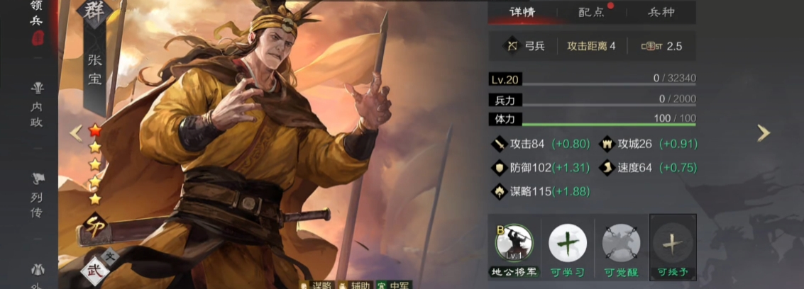 张宝作为群雄阵营的四星弓兵武将,在游戏中主要承担辅助输出和属性增益的角色。他的核心战法地公将军能对敌军群体发动策略攻击,同时吸收敌方防御和谋略属性转化为友军增益,持续2回合。配点时建议主加谋略属性,因为战法伤害率和属性吸收效果都受谋略影响,满级谋略成长2.09,搭配红度提升后效果更显著。速度建议保持50点基础值即可,避免浪费属性点,防御和攻击无需刻意堆叠。