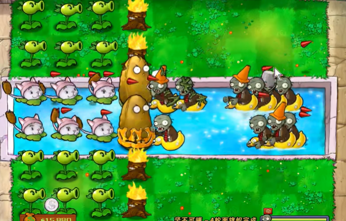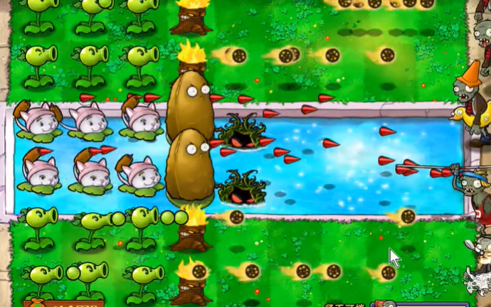 推荐采用双发射手与火炬树桩组合,搭配高坚果构成基础防线。两排双发射手加一排高坚果可消耗约5000阳光,避免使用机枪射手以节省资源。另一种高效阵型为冰西瓜与杨桃组合,将冰西瓜置于第二、四排实现全场减速,水池区域铺满杨桃并覆盖南瓜头保护。杨桃需依赖僵尸移动触发多向攻击,因此冰西瓜的减速效果至关重要。忧郁菇战术同样实用,在第二、四排放置三株忧郁菇,前方用大蒜引导僵尸走位,剩余阳光可补充吸金磁或金盏花。